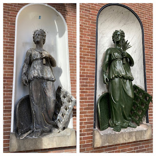 Jochem Duijts heeft deze zinken beelden gemaakt, gerestaureerd in zijn eigen werkplaats en deze week terug geplaatst bij de Korenbeurs in Stad. heel fraai.
